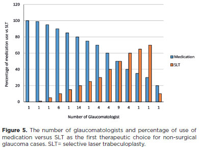When deciding on initial treatment – whether SLT or medication – most physicians preferred pharmacologic therapy. However, the 6-yr results of the LIGHT study demonstrated that initiating treatment with SLT provides superior long-term intraocular pressure control and reduces the need for incisional surgery(19). This discrepancy between evidence-based recommendations and clinical practice reinforces the importance of studies like ours and exemplifies the concept of "tropicalization of medicine". Although SLT has been shown to be more cost-effective than medication in other regions(20,21), its limited use in Latin America may stem from barriers such as accessibility, healthcare system organization, and economic disparities. Furthermore, our survey did not explore whether physicians discussed SLT as an alternative with their patients – an aspect worth investigating in future studies(20,21).