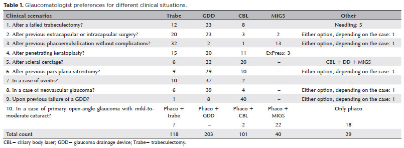 METHODS: A cross-sectional study was conducted using an electronic survey distributed in July 2023 via email to members of the Latin American Glaucoma Society. The questionnaire comprised four sections addressing the specialists' profiles, preferred surgical procedures for open-angle glaucoma, and choices in 10 different clinical scenarios, including congenital glaucoma.