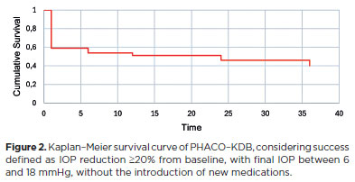 Surgical success was defined as either an IOP reduction of >20% from baseline with IOP between 6 and 18 mmHg without additional medications or a reduction of ≥1 eye drop from baseline with IOP between 6 and 18 mmHg. Patients who did not meet these criteria or required further IOP-lowering interventions after phaco-KDB were considered failures.