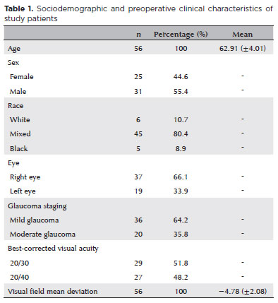 The demographic and preoperative characteristics are summarized in table 1. The mean age was 62.9 years; most patients were male (55.4%) and self-identified as mixed race (80.4%). All patients had mild-to-moderate primary open-angle glaucoma. The mean visual field mean deviation (MD) was −4.75 ± 2.08 dB, assessed with the 24-2 SITA Standard strategy on the Humphrey Visual Field Analyzer (HFA 740i, ZEISS Medical Technology). Approximately 36% of patients had MD values worse than −6 dB, meeting the criteria for moderate glaucoma, although the overall mean was within the mild range.