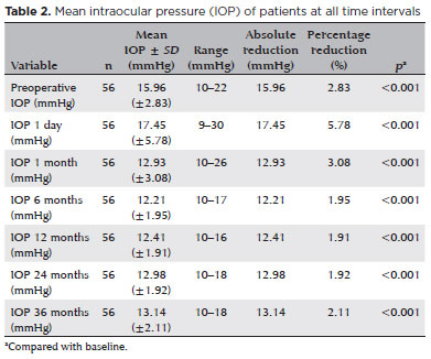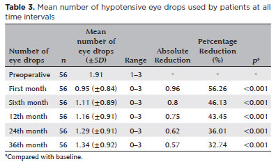 RESULTS: The mean preoperative intraocular pressure decreased from 15.96 ± 2,83) mmHg to 13.14 ± 2,11) mmHg at 36 months, representing a 14.9% reduction (p<0.001). The mean number of eye drops decreased from 1.91 ± 0,75) to 1.34 ± 0,92), a 29.8% reduction (p<0.001). The overall success rate was 69.6% at 36 months.