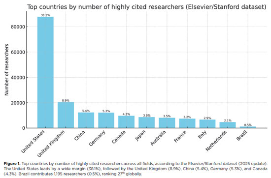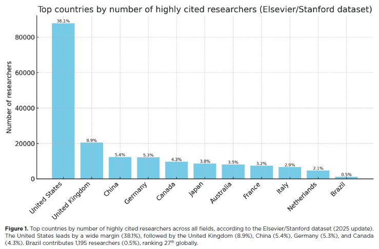 In the global breakdown of more than 230,000 researchers included in the Elsevier/Stanford dataset, the United States leads by a wide margin, with 87,859 scientists (38.1%), followed by the United Kingdom (20,461; 8.9%), China (12,374; 5.4%), Germany (12,167; 5.3%), Canada (9,784; 4.3%), Japan (8,680; 3.8%), Australia (8,120; 3.5%), France (7,422; 3.2%), Italy (6,672; 2.9%), and the Netherlands (4,781; 2.1%). Within this landscape, Brazil contributes 1,195 researchers (0.5%), ranking 27th globally (Figure 1).