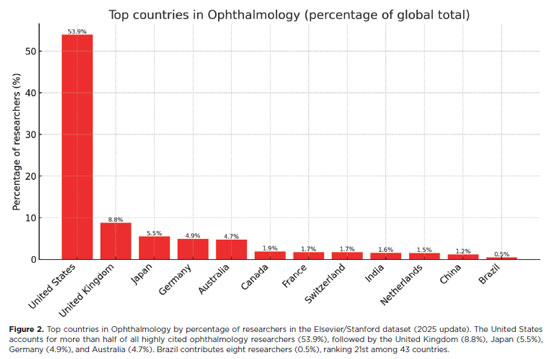 Although China has shown remarkable overall growth in science, its share in Ophthalmology remains limited to 1.2% of the global total. Brazil's representation, at 0.5%, is proportional to its overall share among the world's highly cited researchers. Notably, achieving such recognition in a highly competitive and specialized field underscores the strength of Brazilian Ophthalmology and its meaningful contribution to the international scientific dialogue.