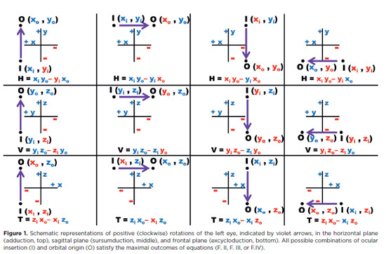 Determining the position of this vector in space – and, consequently, the rotational components of a muscle’s contraction in the horizontal (H), vertical (V), and frontal/torsional (T) planes – requires theoretical consideration of (a) the coordinates of the muscle’s origin O (xo, yo, zo); (b) those of its insertion, I at the primary gaze (xi, yi, zi); and (c) their information after a rotation defined by components H, V, and T in each (2-4).