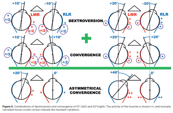 For binocular vision directed to points in space requiring different amounts of rotation in each eye - or for a “final” fusional correction according to Hering's law - disjunctive binocular motions (vergences) are provided. Therefore, vergences and versions may be summed, sometimes resulting in no rotation in one eye and asymmetrical convergence In the other (Figure 5). In the eye without movement, isometric contractions (“co-contractions”) occur.