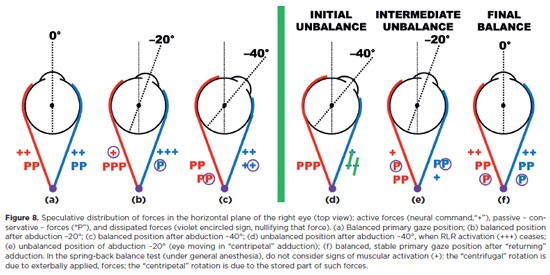 Although periocular structures (including the muscles) could theoretically absorb energy whether shortened (like a compressed spring) or elongated (like a stretched rubber band), they behave “passively” mainly as elastic bands. Experimental data support this: After conjunctival opening (e.g., nasally) or disinsertion of a muscle (e.g., the medial rectus), the eye deviates to the opposite side (temporally)18-101. If the conjunctiva or muscle had accumulated energy to push the eye (like a compressed spring), removal of that push should result in adduction. Instead, abduction occurs. Therefore, the schematic representation in Figure 4 can be improved by considering the balance of forces at the end of a rotation (Figure 6) as due to periocular structures - mainly the muscles - acting as elastic bands.