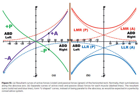 In principle, it might be expected that the variation of forces in a pair of agonist-antagonist muscles would be perfectly symmetrical relative to a “median” position (the primary position) but inverted - that is, the greater the action of one, the smaller that of the other. In addition, the variation of forces due to reciprocal innervation for a desired result (e.g., adduction) and the respective inhibition of the antagonist (relaxation of abduction, therefore allowing more adduction) might be expected to be perfectly linear in the case of a perfectly elastic system. This leads to a graphical and pictorial representation of such forces (Figure 4).