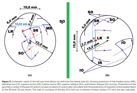 A muscle is composed of numerous fibers that extend over the scleral surface in a line of insertion measuring approximately 9-11 mm. The imaginary frontal circle along which the insertions of the recti muscles are distributed has a diameter of about 19.5 mm (broken blue line, Figure 11), corresponding to a circumference of about 61.3 mm. Therefore (4 x 10)/61.3 ~ 65% of this circle is covered by the recti muscles insertions, a relatively large extension.