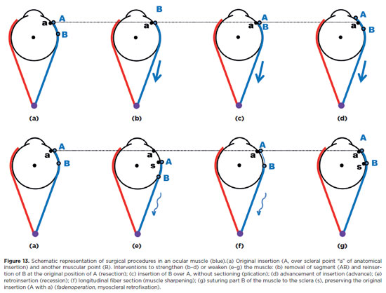 These are classically divided into two broad groups. The first, quantitative, aims to increase (“strengthen”) or decrease (“weaken”) the overall action of a muscle without altering the distribution of muscular forces across spatial planes. Strengthening procedures include resections, plications (shortening), and advances of the insertion (stretching). Weakening procedures include recessions (elongation and slackening), partial or total sections of muscle or tendon (myotomy or tenotomy), with or without excision (myectomy or tenectomy). These may also be “compensatorily” combined such as a “resection” with an equivalent “recession” (Figure 13, the “fadenoperation”).