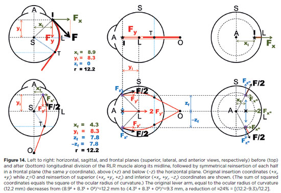 For instance, a horizontal muscle such as the RLR (Figure 14) will have its abductive power reduced, while the vertical and torsional effects of the two symmetrically placed halves cancel each other out. If each half is reinserted at the superior and inferior poles, the effective insertion coincides with the center of curvature, rendering the lever arm null in primary gaze (as well as in any other ocular position in the horizontal plane).