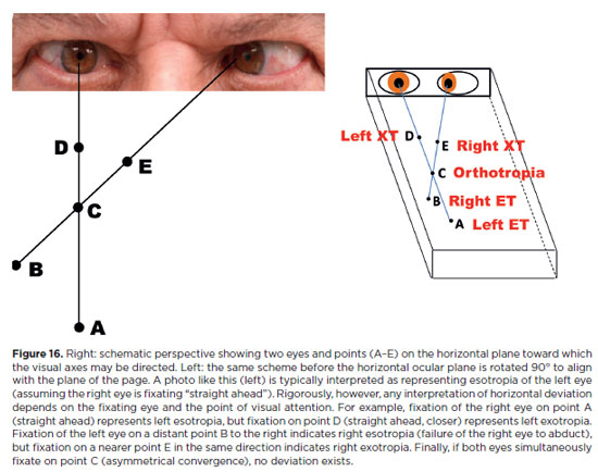The state of visual fixation in each eye is such a fundamental condition for diagnosing oculomotor imbalance that it may sometimes be detected even before formal examination begins. For example, the presence of an “absolute” eye deviation (gaze fixation in a position markedly different from the primary position, often associated with a “vicious” head posture) or different directions of the visual axes in each eye (true strabismus).