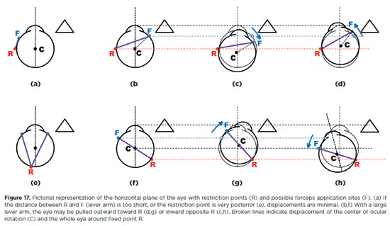 Finally, transposition may also serve to partially or completely neutralize the action of a muscle while leaving it inserted in the eye(22). For example, suppose a rectus muscle is split into two halves and each is reinserted symmetrically on opposite sides of its original plane of action. 1n that case, the effective insertion shifts to an imaginary point inside the globe. The lever arm for torque generation is then shorter than the ocular radius of curvature. Torque becomes null when the “effective” insertion coincides with the ocular rotation center, eliminating rotation by that muscle. While technically demanding, partial symmetrical transpositions (reducing lever arm length and decreasing the angle of force application) are ease to perform, effectively weakening the muscle (Figure 14).