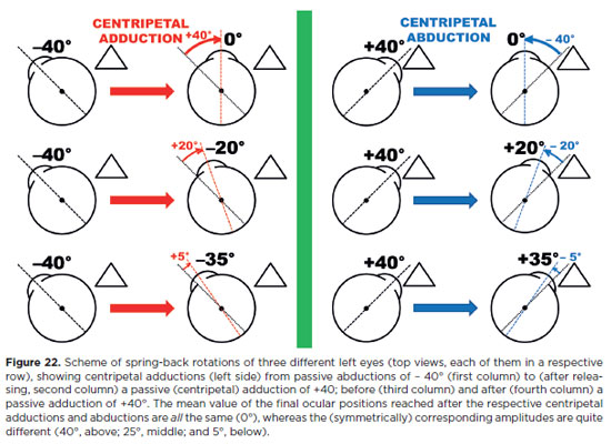 (*21) Since the dissipative forces may be taken as naturally the same for “centripetal” and “centrifugal” rotations, the spring-back rotations may be taken, also, as analogically similar to a motion produced by the “active” contraction of an ocular muscle (and its consequent and expected response). In case of a normal “active” (“centrifugal”) rotation, the origin of the force is the muscular contraction elicited by the neural stimulation, against it works the passive stretch of the antagonist muscle (and of the other periocular elastic structures), besides of dissipative forces. In case of a “passive” spring-back (“centripetal”) rotation, the force is the tangential pulling from (mainly) the shortening of a stretched ocular muscle, against it only dissipative forces act. From a mechanical point of view, the force of a shortening structure (A) be it “actively” elicited (relaxation), or “passively” obtained is the same. Actually, for the same amount of displacement (amplitude of ocular rotation), the passive centripetal motion requires less force than the active centrifugal rotation. Or, conversely, for the same force, the amount of centripetal rotation should be greater.