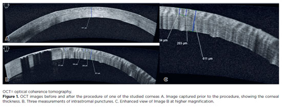 METHODS: Twenty human corneas were obtained and subjected to intrastromal micropuncture using a tattoo machine. Each cornea was divided into two halves: one received pigment, while the other received saline solution as a control. The Cheyenne tattoo machine was operated at 60 Hz, with standardized needle exposure (six passes per application). The machine used cartridges containing five microneedles. The study was registered with Agência Nacional de Vigilância Sanitária ANVISA (numbers 80281110015, 80281110016, and 80281110019). The pigment used was Electric Ink black ink, with a density of 1,271,460 μg/mL. Puncture depth was measured before and after the procedure using both anterior segment optical coherence tomography and histopathological analysis. Puncture depth measurements were analyzed using ImageJ software. Each cornea was measured thrice, and the results were subsequently compared.