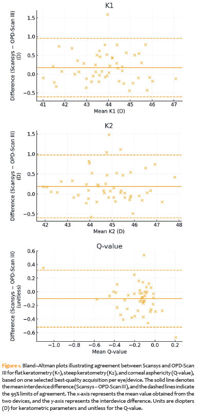 Paired-eye analyses (Table 2) corroborated these findings. Significant differences between devices persisted for Q-value, photopic pupil diameter, and kappa distance. Additionally, small but statistically significant differences were observed for flat and steep keratometry (K1: p=0.003; K2: p=0.002), with Scansys consistently reporting slightly higher values. Although the mean paired-eye differences were modest (approximately 0.17–0.18 D), such discrepancies may be clinically relevant for intraocular lens power calculations and centration of premium IOLs. Mean absolute differences were approximately 0.30–0.32 D, indicating that individual-level disagreement may exceed the average systematic bias. Astigmatism magnitude and keratometric axes remained comparable between devices. All inferential comparisons accounted for within-subject correlation through participant-level clustering.