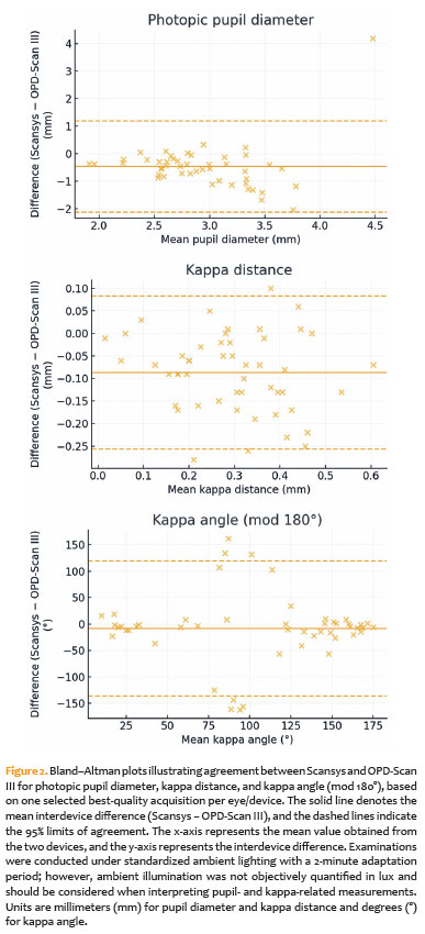 Kappa distance was consistently shorter when measured with Scansys, likely reflecting differences in reference alignment, as Placido-based systems typically reference the pupil center, whereas Scheimpflug devices align to the corneal vertex. This methodological distinction may account for the observed discrepancies and is clinically relevant, as decentration exceeding 0.3 mm has been associated with reduced optical quality in eyes implanted with diffractive trifocal IOLs(22). Although mean differences were systematic, variability in the kappa angle was high, underscoring the challenges of achieving cross-device agreement for alignment-related parameters. These findings suggest that direct substitution of alignment metrics across platforms should be avoided, particularly in surgical planning and longitudinal follow-up, where consistency of measurement reference is critical.