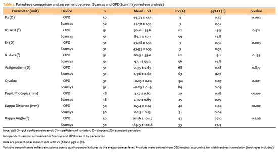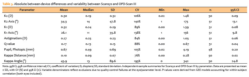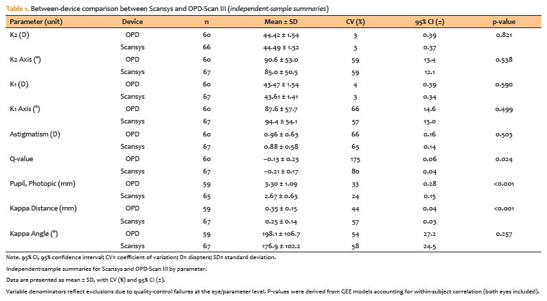 RESULTS: The effective sample size varied by parameter (independent summaries: 59–67 eyes; paired comparisons: 48–51 eyes). In paired-eye analyses, the Scheimpflug-based tomographer measured slightly higher keratometry values than the Placido-based topographer (K1: 43.95 vs. 43.78 D, p=0.003; K2: 44.91 vs 44.73 D, p=0.002), more negative Q-values (p=0.001), smaller photopic pupil diameter (p<0.001), and shorter kappa distance (p<0.001). Mean absolute differences were 0.32 D for K1 and 0.30 D for K2, with high dispersion for angular metrics (kappa angle coefficient of variation: 195%).