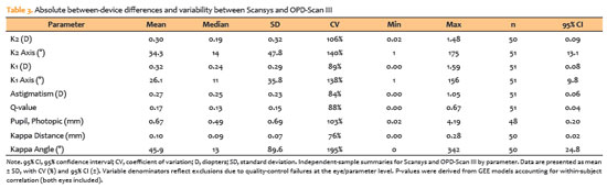Absolute differences and coefficients of variation are presented in Table 3. Variability was particularly pronounced for steep keratometry (mean absolute difference: 0.30 D; CV: 106%) and photopic pupil diameter (mean absolute difference: 0.67 mm; CV: 103%). Angular parameters, such as kappa orientation, demonstrated the greatest dispersion (CV: 195%), indicating substantial interdevice variability at the individual-level despite relatively consistent group means. These findings further support the limited interchangeability of the two devices without calibration.