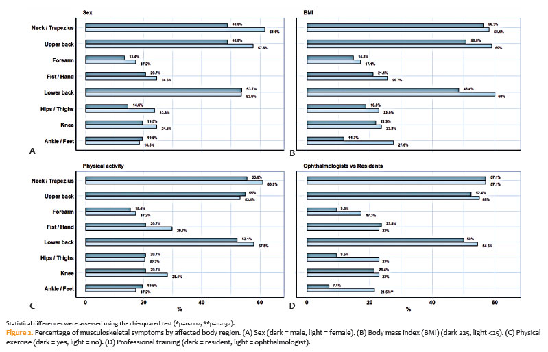 Previous studies have shown that the cervical, upper back, and lumbar regions are the most commonly affected body areas among ophthalmologists(1,9,12). Consistently, these regions were also identified in our study as the primary sites of musculoskeletal symptoms among Brazilian ophthalmologists. Pain of greater intensity in these areas may be associated with prolonged positioning of the upper limbs during ophthalmic examination(1). Moreover, most participants in our study reported dissatisfaction with workplace ergonomics. These findings underscore the urgency of improving working conditions to enhance ergonomics and reduce the risk of MSDs.