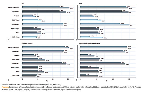 PURPOSE: To assess musculoskeletal symptoms, identify the most affected body areas, and investigate factors associated with the development of musculoskeletal disorders among ophthalmologists in Brazil.