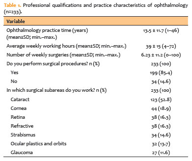 The mean duration of professional practice in ophthalmology was 13.5 ± 11.7 years (range 1–46 years), and the mean weekly workload was 39.0±15 hours (range 4–72 hours). Among participants, 85.4% (n=199) performed surgical procedures, with the majority (52.8%, n=123) performing cataract surgery (Table 1). The mean number of weekly surgeries performed was 6.2 ± 11.2 (range 0–100).
