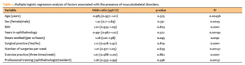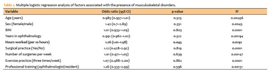 Logistic regression analysis indicated that weekly working hours were significantly associated with the presence of MSDs, with a 26% increase in the likelihood of symptoms for every additional 10 hours of work (odds ratio [OR] = 1.26, 95% confidence interval [CI] 1.01–1.58, p=0.04) (Table 2). Other variables, including surgical practice, number of weekly surgeries, regular exercise, and professional training, were not significantly associated with the presence of MSDs.