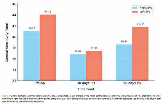 This prospective study quantitatively demonstrated a significant decline in central corneal sensitivity following phacoemulsification, with partial recovery observed 90 days postoperatively. In the right eyes, mean sensitivity decreased from 41.14 mm preoperatively to 36.82 mm at 30 days and then increased to 38.64 mm at 90 days, with a similar pattern observed in the left eyes. Considerable interindividual variability was noted in postoperative changes, with most eyes showing improvement by 90 days, while a smaller subset exhibited persistent reductions or values exceeding baseline(18-30). These results are consistent with previous studies reporting the transient but measurable effects of cataract surgery on corneal innervation and the gradual activation of neural regenerative mechanisms(10-17).
