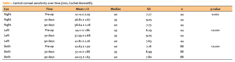 RESULTS: Corneal sensitivity decreased after surgery. In right eyes, mean sensitivity declined from 41.14 ± 7.77 mm at baseline to 36.82 ± 9.03 mm at 30 days and partially recovered to 38.64 ± 7.73 mm at 90 days. In left eyes, sensitivity decreased from 44.11 ± 6.29 mm to 37.39 ± 9.05 mm at 30 days and recovered to 41.82 ± 7.63 mm at 90 days. Left eyes showed higher sensitivity than right eyes at baseline (p=0.023) and at 90 days (p=0.018). At 90 days, complete or near-complete recovery (within ± 5 mm of baseline) occurred in 73.2% of right eyes and 78.0% of left eyes, while improvement above baseline (≥ +5 mm) occurred in 7.3% and 4.9%, respectively. Age showed weak, nonsignificant correlations with Δ90 (p=−0.14 to −0.19; p>0.2).