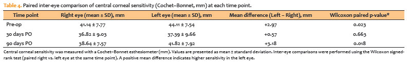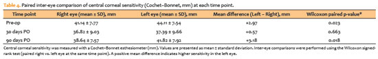 Paired inter-eye comparisons (Table 3) indicated that left eyes had higher sensitivity than right eyes at baseline (mean difference +2.97 mm, p=0.023) and at PO-90 (mean difference +3.18 mm, p=0.018). In contrast, no significant difference was observed at PO-30 (mean difference +0.57 mm, p=0.663).