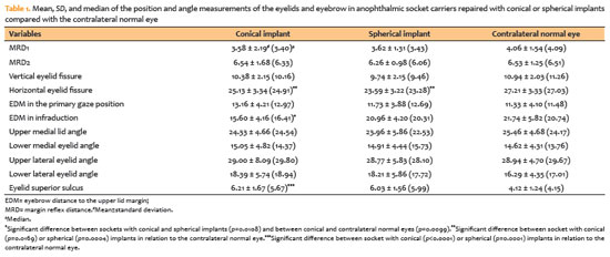 In conclusion, eyebrow and eyelid positions were largely similar in anophthalmic sockets reconstructed with conical or spherical implants, except for a reduced EDM in infraduction associated with conical implants. Both implant formats were associated with a deeper superior eyelid sulcus and a smaller horizontal palpebral fissure compared with the contralateral normal eye.