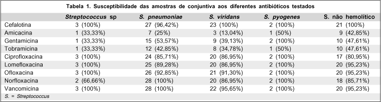Neste levantamento, a prevalência de isolamentos positivos de Streptococcus sp em casos de conjuntivite foi 6,63%, sendo as espécies mais comuns S. pneumoniae, S. viridans e Streptococcus não hemolítico. No antibiograma das espécies mais freqüentes, observamos uma maior susceptibilidade à cefalotina, às quinolonas e à vancomicina. Em estudo realizado em 1998, 37 amostras de 92 casos de conjuntivite foram positivas para S. pneumoniae, correspondendo a 40,22% dos casos(4). Em estudo considerando os 2 principais patógenos de conjuntivite bacteriana em crianças, Haemophilus influenzae e Streptococcus pneumoniae, foram encontrados 75 casos de Streptococcus pneumoniae (30%), com susceptibilidade maior à ciprofloxacina e ofloxacina, e atividade intermediária de gentamicina e tobramicina. Os autores consideram como melhor opção terapêutica uma fluoroquinolona tópica(5). Em outros estudos, o Staphylococcus aureus e o S. epidermidis, são considerados agentes etiológicos mais comuns(5-6).