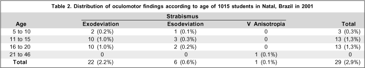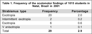 RESULTADOS: Dos 1024 estudantes, foram analisados 1015; 29 eram portadores de estrabismo (2,9%), sendo 20 com exotropia manifesta (2%), 2 com exotropia intermitente (0,2%), 6 com esotropia (0,6%) e 1 com anisotropia em V (0,1%).