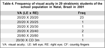 The medical charts of 29 students with strabismus were analyzed, with the following results: 25 (86%) had visual acuity (with or without optic correction) of 20/20 (both eyes) to 20/20 X 20/30 and 4 (14%) presented some degree of amblyopia (Table 4), with all the amblyopic students having exodeviation (XT).