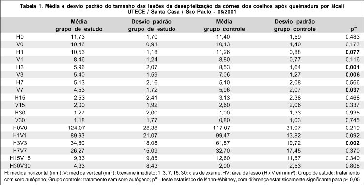 A tabela 1 mostra à desepitelização da córnea, imediatamente após a queimadura e nos dias 1, 3, 7, 15 e 30, acompanhados da média e do desvio padrão das lesões em cada dia. A cicatrização no sentido horizontal ficou próxima da significância no dia 1 ( p= 0,077) e significante no dia 3 ( p= 0,001). O grupo em estudo apresentou diminuição do tamanho da lesão no sentido horizontal mais rapidamente que o grupo controle apenas neste dia. Já nos outros dias, não encontramos diferença estatisticamente significante. A cicatrização no sentido vertical mostrou diferença estatisticamente significante nos dias 3 ( p= 0,006) e 7 ( p= 0,037) e novamente no grupo de estudo ela mostrou-se mais rápida. Quando analisada a área desepitelizada e em re-epitelização (medida horizontal x medida vertical), encontrou-se diferença estatisticamente significante no dia 3 ( p= 0,002), mostrando que, considerando-se a área da lesão, o grupo em estudo, num primeiro momento, re-epitelizou significativamente mais rápido que o grupo controle (Tabela 1).