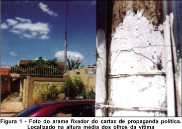 No local do acidente obtivemos mais informações sobre o mecanismo do trauma. Tratava-se de um arame amarrado a um poste fixando um cartaz de propaganda política. O arame era liso e pré-cozido com 1,5 milímetros de diâmetro localizado a 1 metro e 55 centímetros de altura do solo, exposto à altura dos olhos da vítima (Figura 1).