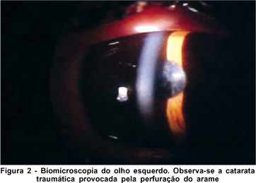 O paciente foi submetido à cirurgia de emergência, sob anestesia geral, utilizando a técnica de facectomia extracapsular sem lente intra-ocular (LIO) com incisão límbica de 2,0 mm às 12:00 h. Foi aproveitada a abertura da cápsula anterior feita pelo arame e realizada a sutura da lesão corneana. Também foi feita injeção intravítrea de vancomicina 1mg e fortaz 2 mg como profilaxia para endoftalmite. Não foi notada ruptura da cápsula posterior.