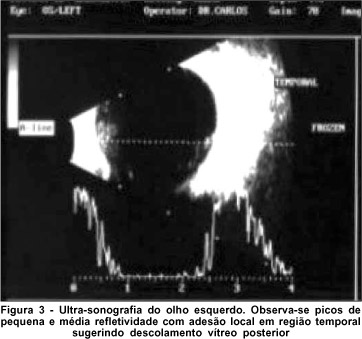 No exame constatou-se acuidade visual (AV) 20/25 no olho direito (OD) e 20/100 no olho esquerdo (OE). À biomicroscopia observou-se em OE hiperemia pericerática, câmara anterior média com discreta fibrina, lesão transversal auto-selante às 14 horas, localizada na córnea, medindo cerca de 2,5 mm, a cerca de 3 mm do limbo, pupila de contorno regular com 4 mm de diâmetro e opacificação do cristalino (Figura 2). O teste de Seidel foi negativo. A tonometria de aplanação do OE apresentava-se com 8 mmHg e do OD com 10 mmHg às 19:40 h. A fundoscopia do OD não apresentava alterações perceptíveis no pólo posterior e o exame do OE foi dificultado pela opacificação do cristalino. O exame ecográfico bidimensional demonstrou picos de pequena e média refletividade em câmara vítrea localizado em região temporal posterior do OE com pós-movimento. Observou-se a retina aplicada e ausência de corpo estranho (Figura 3).