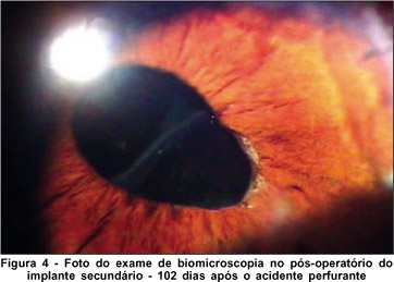 O olho traumatizado após 36 dias da cirurgia de emergência, encontrava-se com refração: +11,50 = -0,75 x 180º e acuidade visual de 20/20 no olho esquerdo. Pupila com discreta irregularidade devido à sinéquia entre a íris e a cápsula anterior às 14:00 h e câmara anterior profunda. Córnea transparente exceto pela opacidade na área da sutura, mantendo pressão intra-ocular de 16 mmHg. O mapeamento de retina mostrou-se normal, inclusive na área de acometimento vítreo descrito na ecografia bidimensional realizada no pré-operatório. Diante destes resultados, o paciente foi submetido à nova cirurgia, sob bloqueio peribulbar e sedação, para implante secundário de LIO acrisof com poder dióptrico de 20,0 dioptrias no sulco ciliar devido à fibrose capsular e conseqüente impossibilidade de abrir-se o saco capsular. Durante o ato operatório foi necessária a realização de capsulotomia posterior, não havendo perda vítrea. No 12º dia de pós-operatório, o paciente já apresentava refração final: -0,75 esférico (0,9) no olho operado e sem queixas ou sinais de infecção e inflamação no exame oftalmológico (Figura 4).