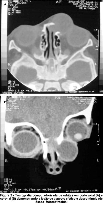 A tomografia computadorizada de crânio e órbitas mostrou uma imagem cística de aproximadamente 2,0 X 2,0 cm, com halo hiperdenso e hipodensidade central. A lesão se apresentava adjacente a uma falha óssea, caracterizada por uma descontinuidade entre o osso frontal e o etmóide esquerdo (Figura 2), confirmando o diagnóstico de uma meningocele fronto-etmoidal. Não se observou córtex cerebral herniado pela falha óssea.