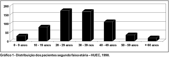 Durante o período estudado foram atendidos 622 pacientes portadores de traumas oculopalpebrais no Pronto-Atendimento do Serviço de Oftalmologia do HUEC, sendo 87% do sexo masculino e 13% do sexo feminino. A idade média dos pacientes atendidos foi de 31,4 anos (± 13,3 anos), havendo predomínio do trauma oculopalpebral no grupo entre 20 e 50 anos de idade, com 73,3% dos atendimentos (Gráfico 1). Com relação a procedência dos pacientes notou-se que 86,4% foram provenientes da cidade de Curitiba e 13,6% da região metropolitana e interior do Estado do Paraná.