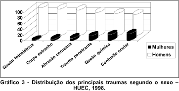 Os traumas oculopalpebrais mais freqüentes no homem foram queimadura fotoelétrica e corpo estranho córneoconjuntival, enquanto na mulher foram contusão ocular e a queimadura química (Gráfico 3).