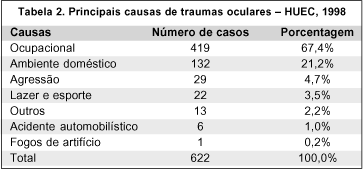 Apesar de localizado em uma capital de Estado, o Pronto-Atendimento Oftalmológico do HUEC, segundo nosso estudo, recebe uma grande demanda de acidentes ocupacionais e domésticos, diferindo o perfil epidemiológico dos serviços de outras cidades grandes, que recebem muitas vítimas de traumas ocasionados pela chamada violência urbana (acidentes automobilísticos, ferimentos por armas branca e de fogo), conforme relatado em outros estudos 1, 7. Em nossa casuística os ferimentos penetrantes do globo ocular ocorreram em 3,7% dos pacientes, concordando com dados da literatura 7, 8. Nas cidades de Rio de Janeiro e São Paulo os acidentes de trânsito ocupam o primeiro lugar nas causas de ferimentos penetrantes do globo ocular em adultos, 7 ao contrário dos resultados verificados em nosso trabalho, onde os acidentes penetrantes ocorreram mais no ambiente doméstico.