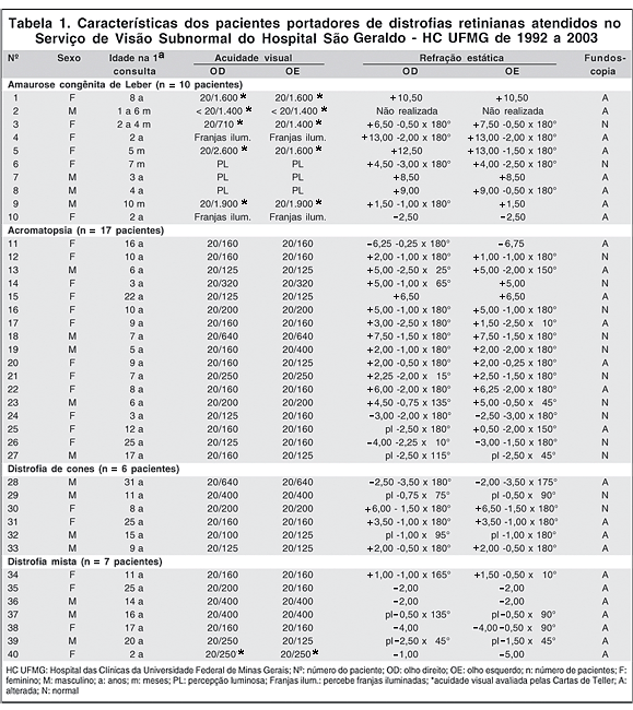 Recentemente, foram realizadas, em nosso serviço, revisões dos casos de retinose pigmentar(20) e doença de Stargardt(21). Por esta razão, e por existirem poucos dados sobre o assunto na literatura nacional, decidimos realizar, no presente estudo, a análise dos casos das demais distrofias que se manifestam na infância: a ACL, a acromatopsia, a distrofia de cones e a distrofia mista. Procuramos traçar um perfil do quadro clínico e das alterações encontradas nos exames complementares de todos os pacientes portadores destas doenças atendidos no Serviço de Visão Subnormal do Hospital São Geraldo, Hospital das Clínicas da Universidade Federal de Minas Gerais, desde sua criação em 1992 até 2003.