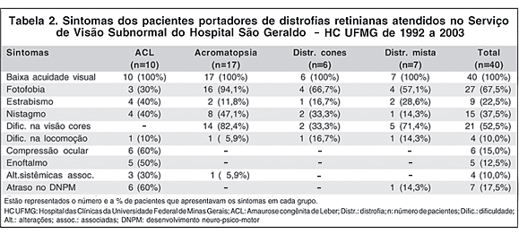 No grupo da distrofia mista, além da BAV, os sintomas mais freqüentes foram a dificuldade na visão de cores (5 pacientes, 71,4%) e a fotofobia (4 pacientes, 57,1%). Menos freqüentes foram o estrabismo (2 pacientes, 28,6%), o nistagmo e a dificuldade na locomoção (1 paciente cada, 14,3%). Não foram encontradas alterações sistêmicas, mas 1 paciente (14,3%) apresentava atraso no DNPM.