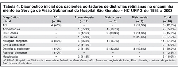 Os diagnósticos iniciais feitos no encaminhamento dos pacientes ao Serviço de Visão Subnormal estão listados na tabela 4. O diagnóstico inicial mais freqüente foi o nistagmo congênito (11 pacientes, 27,5%), seguido de distrofia a esclarecer (8 casos, 20%).