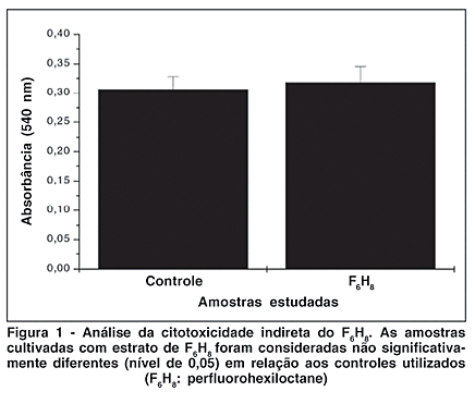 O teste de citotoxidade indireta mostra claramente que o F6H8 não elimina substâncias que possam ser deletérias à célula. Estes achados condizem com os dados obtidos por Meinert e Roy com diferentes culturas de células(30). Desta forma podemos afirmar de forma conclusiva que o F6H8 não apresenta toxicidade indireta. As alterações são, portanto, contato-dependentes e observadas após um determinado período de exposição. Durante este experimento testes realizados com tempos de contato mais curtos, entre as células com os diferentes pesos e as substâncias, mostraram alterações menos marcadas enquanto que tempos de contato maiores levavam a destruição celular que impedia qualquer análise (dados não mostrados).