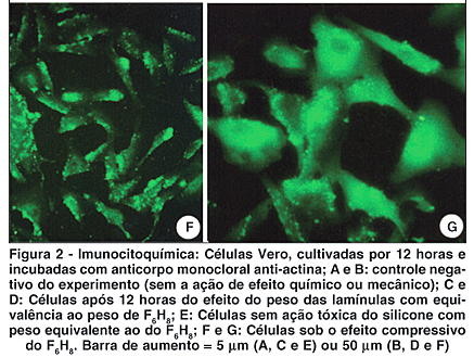Pode-se observar nos controles negativos do experimento, células formando um tapete semiconfluente e que apresentavam seus filamentos de actina homogeneamente distribuídos e ocupando todo o citoplasma (Figura 2A). Na figura 2B observa-se detalhe da figura anterior. Na figura 2C, são apresentadas as células após 12 horas do efeito do peso das lamínulas com equivalência ao peso do F6H8. Observaram-se alterações na morfologia celular com retração citoplasmática, formação de prolongamentos finos e longos, com conseqüente acúmulo de actina próximo aos limites celulares. Detalhe da amostra anterior é mostrado na figura 2D. Nas células sob a ação tóxica do silicone observaram-se células com morfologia irregular, ou fragmentada, com retração citoplasmática e ausência de prolongamentos (Figura 2E). Quando cultivadas em meio de cultura em contato direto com o F6H8, as células apresentaram alteração na morfologia, regiões de acúmulo de actina com distribuição pontual (Figuras 2F e 2G).