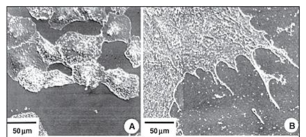 Nas células que cresceram sobre as lamínulas de vidro sem qualquer tratamento observou-se tapete celular semiconfluente composto por células bastante achatadas. Algumas vesículas podem ser observadas na superfície dessas células (Figura 3A e 3B). Após 12 horas do efeito do peso das lamínulas com equivalência ao peso de F6H8, visualizaram-se células retraídas, com morfologia bastante irregular, apresentando prolongamentos finos e longos conectando uma célula a outra (Figura 3C). Foi observado ainda, um maior aumento de vesículas e/ou microvilosidades na superfície das células (Figura 3D). Nas células cultivadas em meio de cultura em contato direto com o F6H8 encontramos retração citoplasmática e projeções de alguns prolongamentos (Figura 3E e 3F).