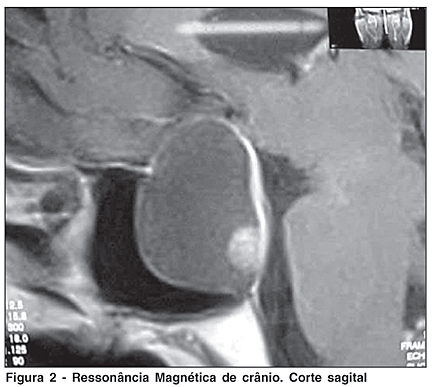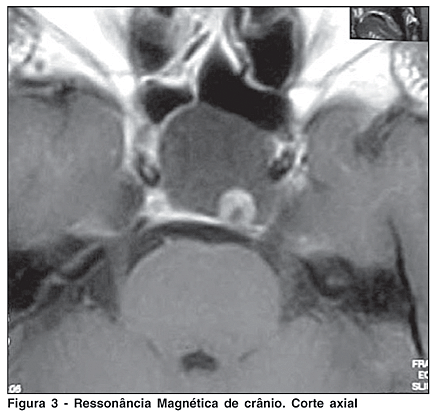 A ressonância magnética evidenciou lesão expansiva cística localizada na sela túrcica, com crescimento supra-selar, medindo cerca de 3,4 x 2,8 cm x 2,4 cm em seus maiores diâmetros, sem realce após o uso endovenoso de contraste. Apresentava obliteração da cisterna supra-selar e importante compressão sobre o quiasma óptico, sugestivo de macroadenoma predominantemente cístico (Figuras 2 e 3).