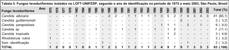 Entre os 63 fungos leveduriformes identificados, verificou-se isolamento de seis espécies distintas, havendo maior freqüência do gênero Candida (n=59 ou 93,7%) e da espécie C. albicans (n=41 ou 65,1%) (Tabela 5).
